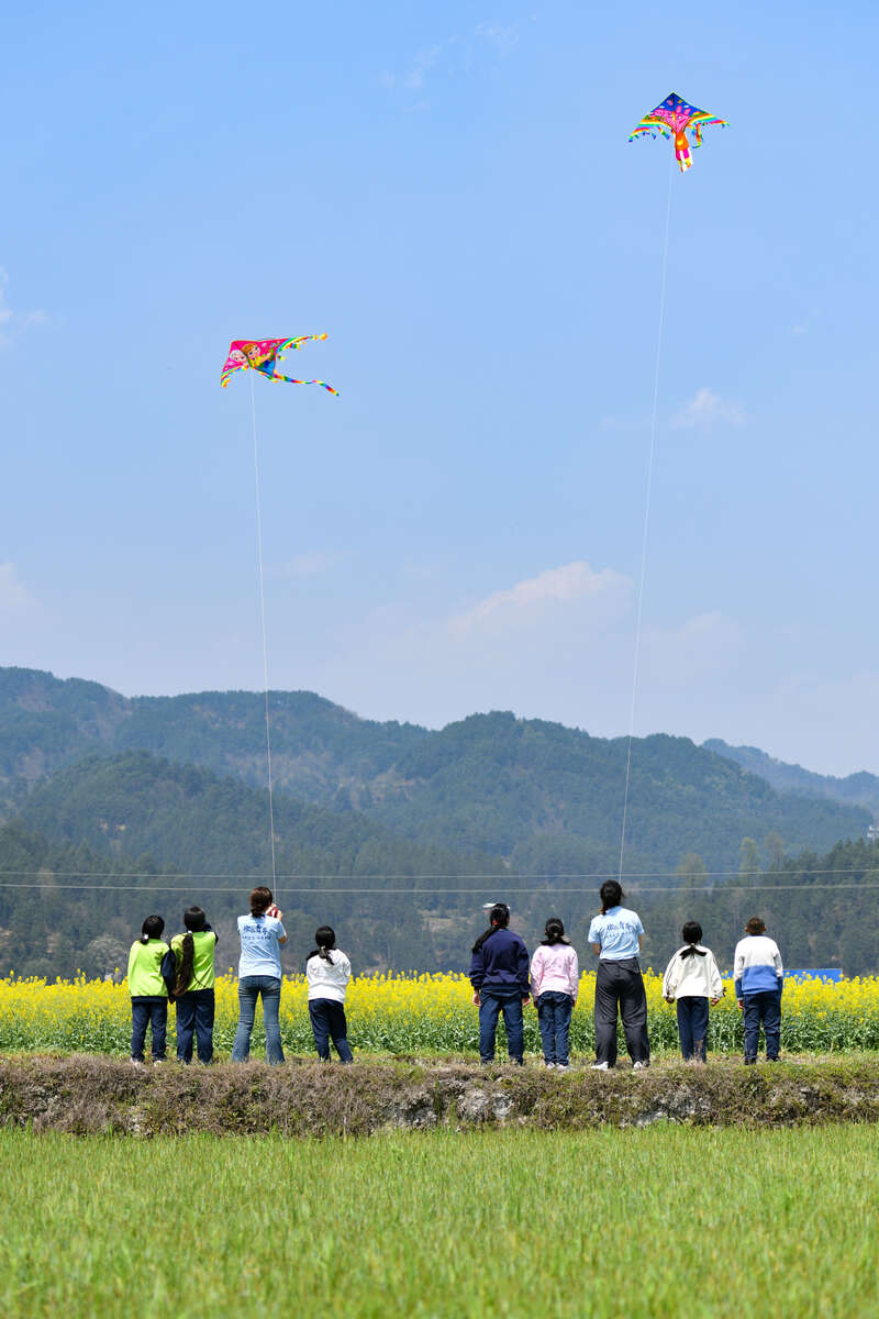 3月26日,贵州省黄平县,徐州医科大学的研究生支教团成员与黄平县上塘镇中心小学的学生在野外放风筝。梁文/摄