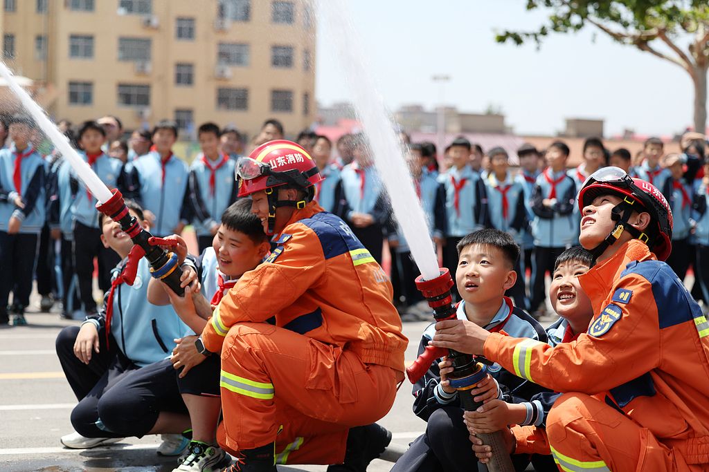 2025年5月12日,山东省临沂市郯城县第三实验小学开展全国防灾减灾日活动,小学生在消防救援人员的帮助下体验使用灭火装备。