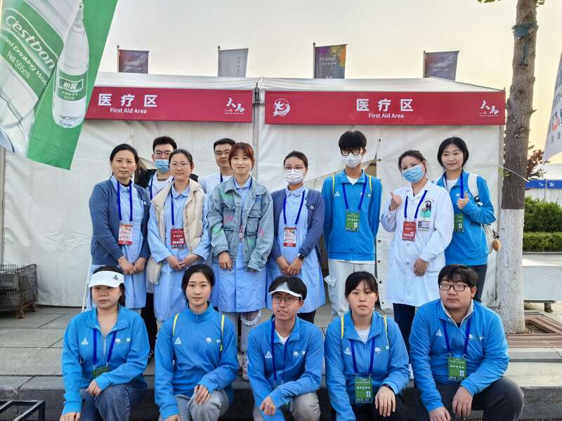 800名医保志愿者是赛场上的“移动医疗站”。晨光未现,他们便开始反复检查医疗物资储备,调试设备状态,确保万无一失。赛事全程,他们时刻关注选手状态,在补给点随时待命,为体力透支的选手递上能量胶、电解质水;对出现抽筋、中暑的参赛者,迅速进行拉伸、降温等紧急处理。