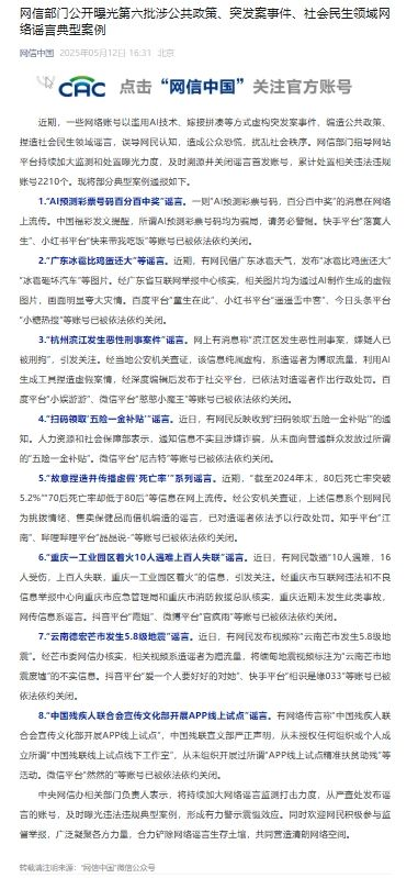 近期,一些网络账号以滥用AI技术、嫁接拼凑等方式虚构突发案事件、编造公共政策、捏造社会民生领域谣言,误导网民认知,造成公众恐慌,扰乱社会秩序。网信部门指导网站平台持续加大监测和处置曝光力度,及时溯源并关闭谣言首发账号,累计处置相关违法违规账号2210个。现将部分典型案例通报如下。