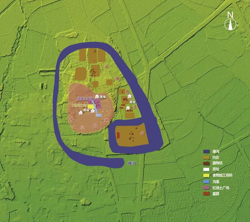 该遗址被称为早期南方村落的“化石”和重要样本,因为它重点揭露了上山文化中、晚期聚落的布局与演变。遗址中西部为相对独立的中心台地,外围围绕着十余座人工堆筑的土台,再外围则是环壕,呈现出“中心台地、外围土台、环壕”三重聚落结构。中心台地上发现上山文化中期房址、食物加工场、磨盘储藏坑、沟渠等遗迹。房址与食物加工场侧畔的沟渠,让“小桥流水人家”的场景跃入眼帘。