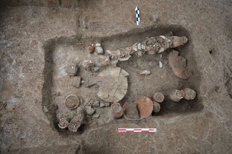 让考古人员感到意外的是,在中心台地外围东部的土台上还发现了3座上山文化晚期高等级的墓葬。墓坑长2米左右,随葬陶器较多,均在20件以上。从随葬品的数量分析,这些墓葬等级较高,说明距今9000年左右的上山文化社会已经出现社会分化。