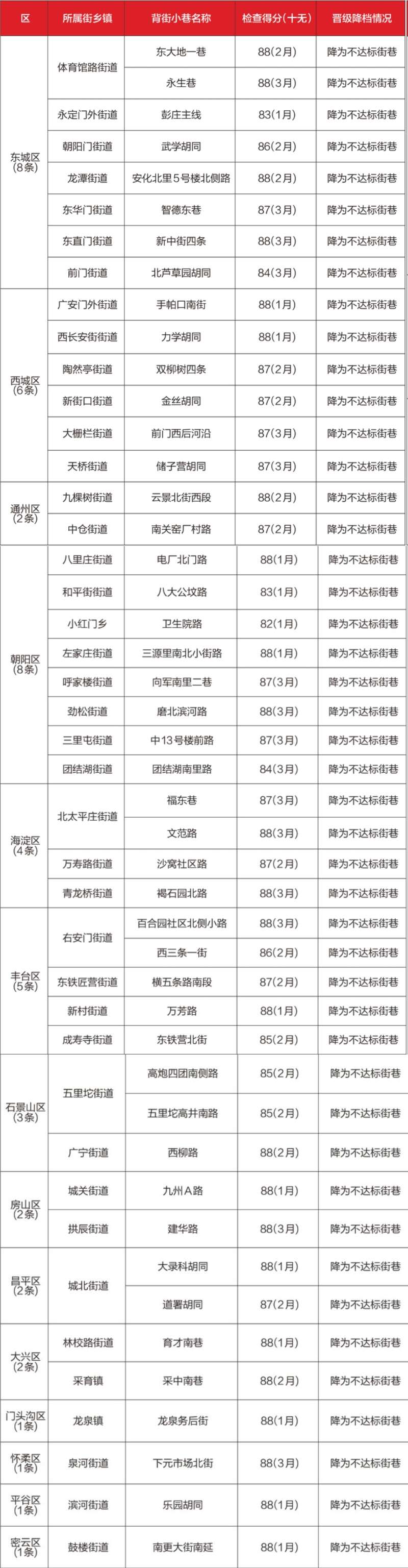 二是降档情况。2025年一季度全市按照达标街巷标准实施降档。共有46条背街小巷“十无”检查得分在90分以下,降为不达标街巷,其中东城区、朝阳区各8条,西城区6条,丰台区5条,海淀区4条,石景山区3条,通州区、房山区、昌平区、大兴区各2条,门头沟区、怀柔区、平谷区、密云区各1条。