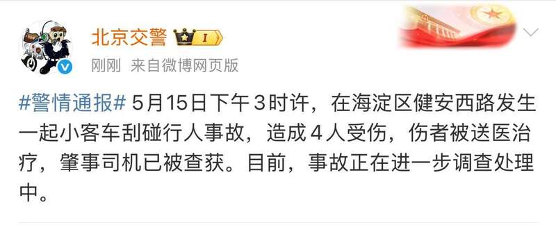 据 @北京交警 通报,5月15日下午3时许,在海淀区健安西路发生一起小客车刮碰行人事故,造成4人受伤,伤者被送医治疗,肇事司机已被查获。目前,事故正在进一步调查处理中。