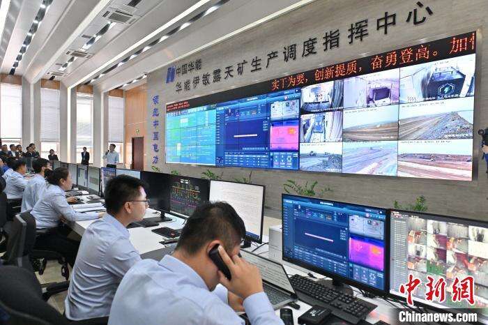 5月15日,内蒙古呼伦贝尔,伊敏露天矿调度中心调度无人电动矿卡 “华能睿驰”。当日,全球首个百台纯电动无人驾驶矿用卡车集群在内蒙古投运。据悉,此次投运的“华能睿驰”车型取消了驾驶室的设计。车内安装了564千瓦时的磷酸铁锂电池组,单次换电时间小于6分钟,一次充满电最多需要1小时,满电状态可拉载90吨货物行驶约60公里。中新社记者 刘文华 摄