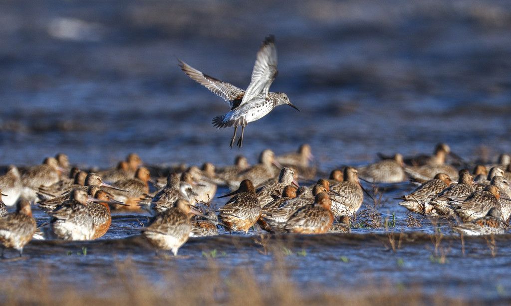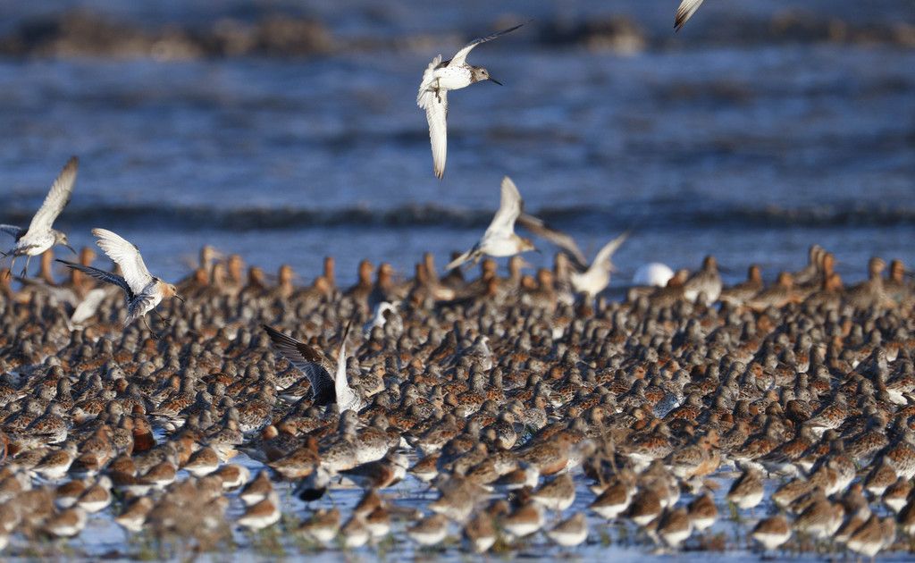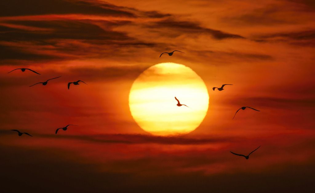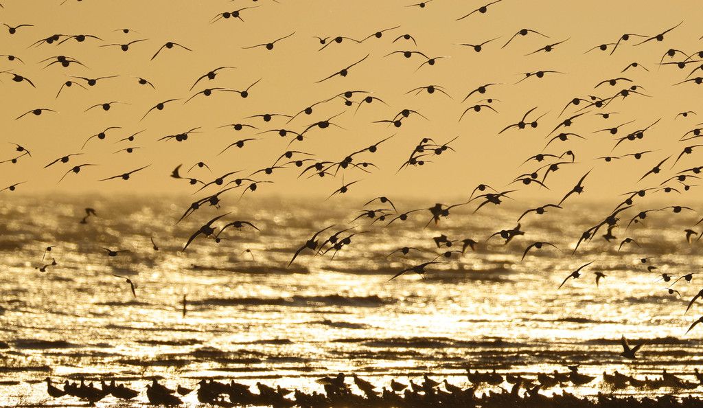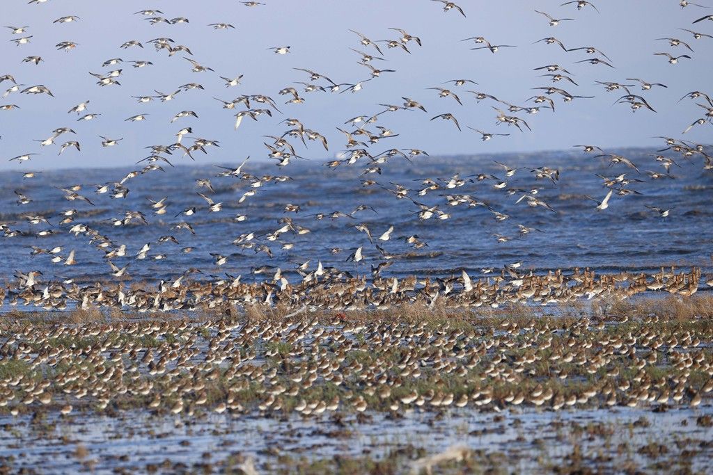 2025年5月15日,辽宁营口,傍晚时分,群鸟欢鸣,振翅齐飞,场面壮观。