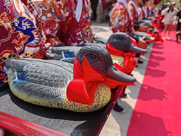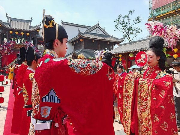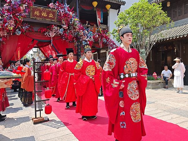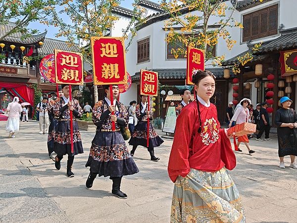 2025年5月19日,湖北省孝感市,云梦祥云湾景区上演大型中式婚礼,迎亲队伍隆重到场,吸引众多游人围观拍照。