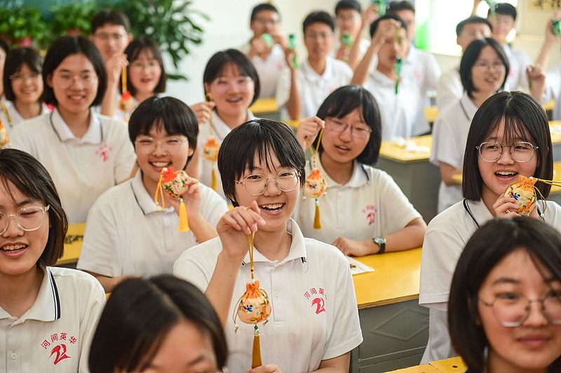 2025年5月19日,河北河间英华学校的高中部一年级的学生在中医药课堂上展示制作的中药香囊。