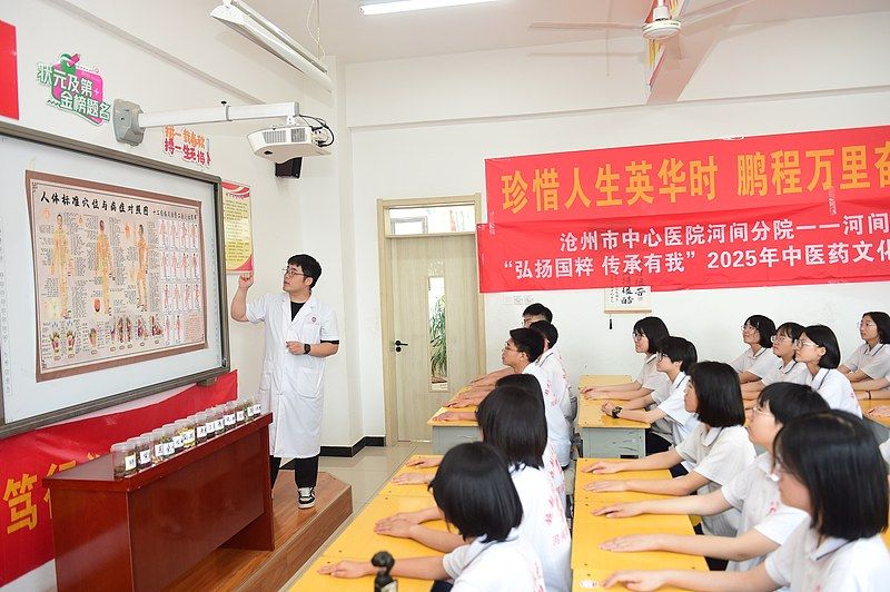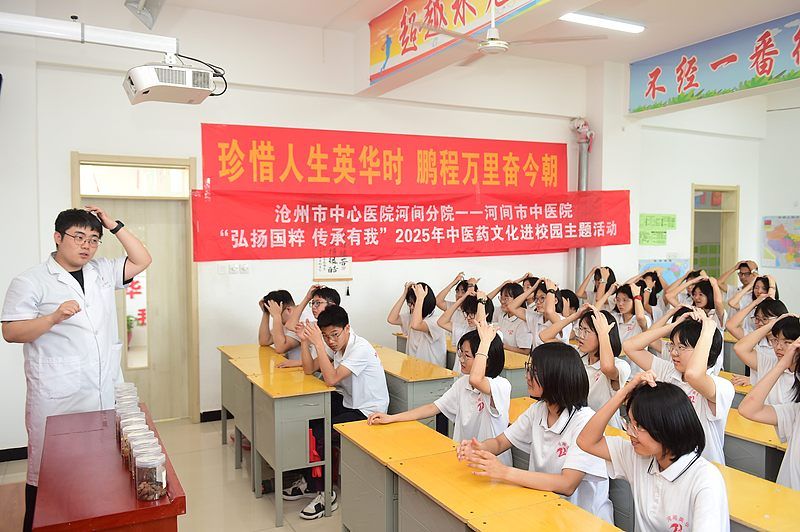 2025年5月19日,河北沧州市中心医院河间分院(河间市中医院)的中医为河间英华高中部一年级的学生讲解人体经络与穴位。