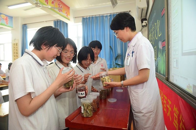 2025年5月19日,河北河间,英华学校高中部一年级的学生在中医药课堂上辨识中药。