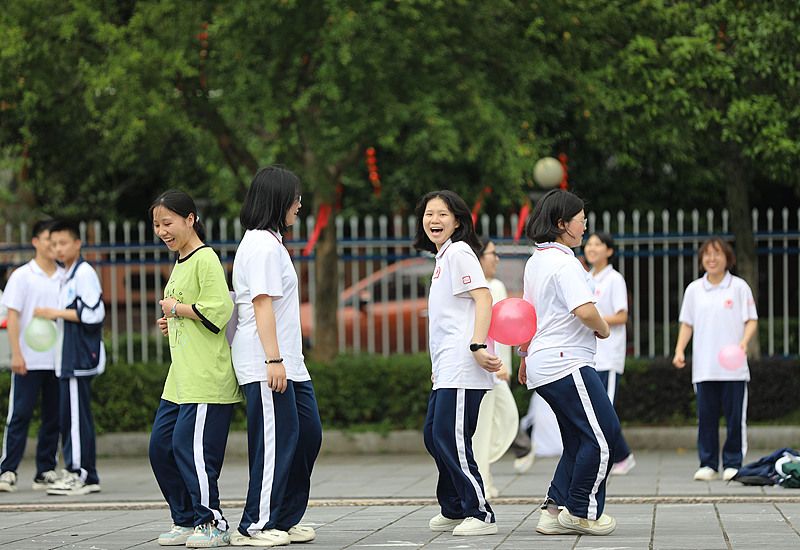 2025年5月21日,湖南省永州市道县第一中学,高三学生在参与背夹气球跑游戏。
