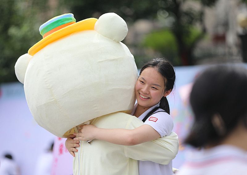 2025年5月21日,湖南省永州市道县第一中学,高三学生在体验“爱的抱抱”。