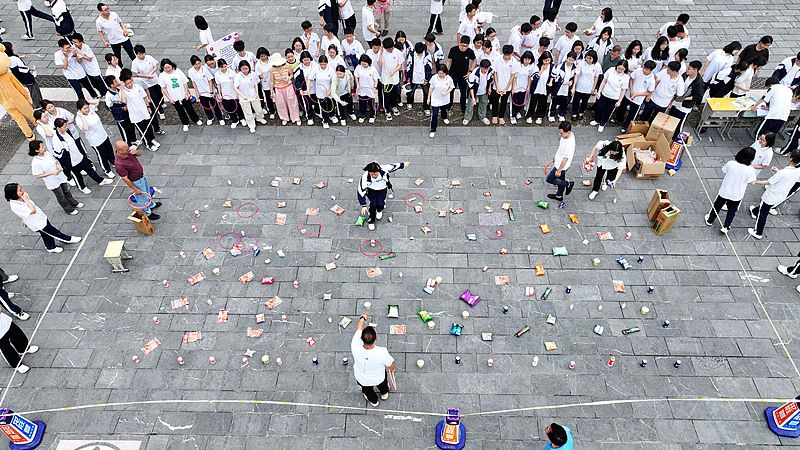 2025年5月21日,湖南省永州市道县第一中学,学生在进行套圈活动。