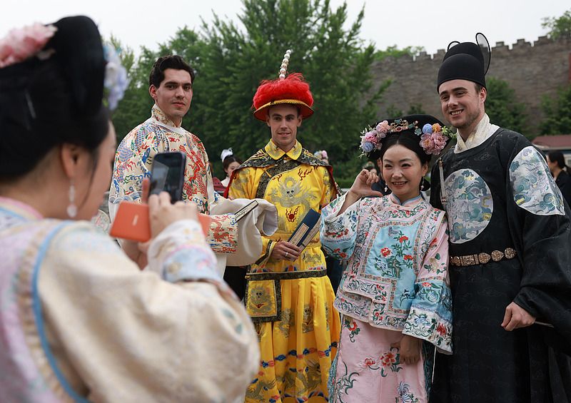 2025年5月8日,北京故宫东华门外,身着“格格装”的中国游客与澳大利亚游客合影留念。