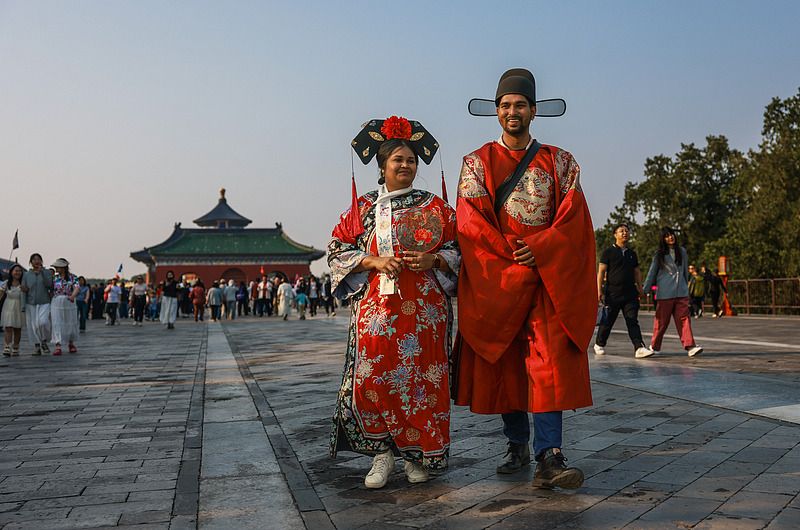 2025年5月10日,北京天坛公园。24岁的印度裔新加坡青年Thane和新婚妻子Sharon穿着红色汉服走在天坛公园内的中轴线上。