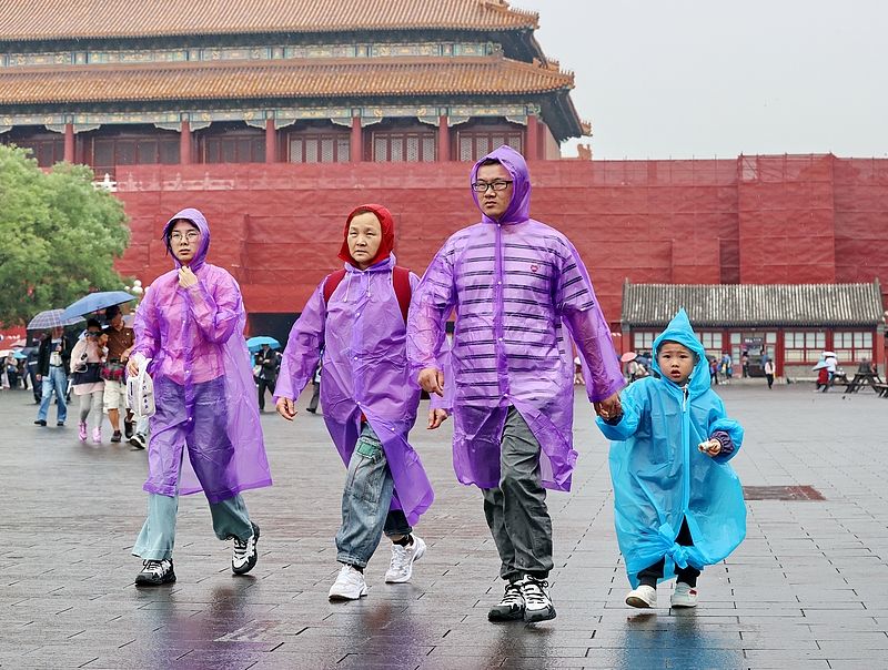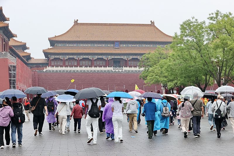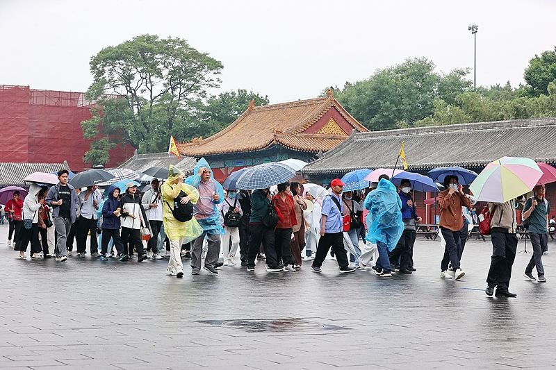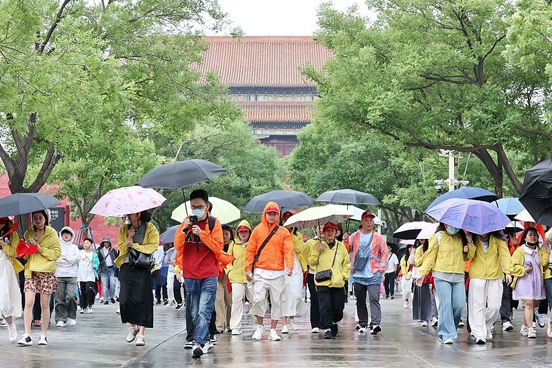 2025年5月22日,北京风雨交加,游客热情不减游览故宫。