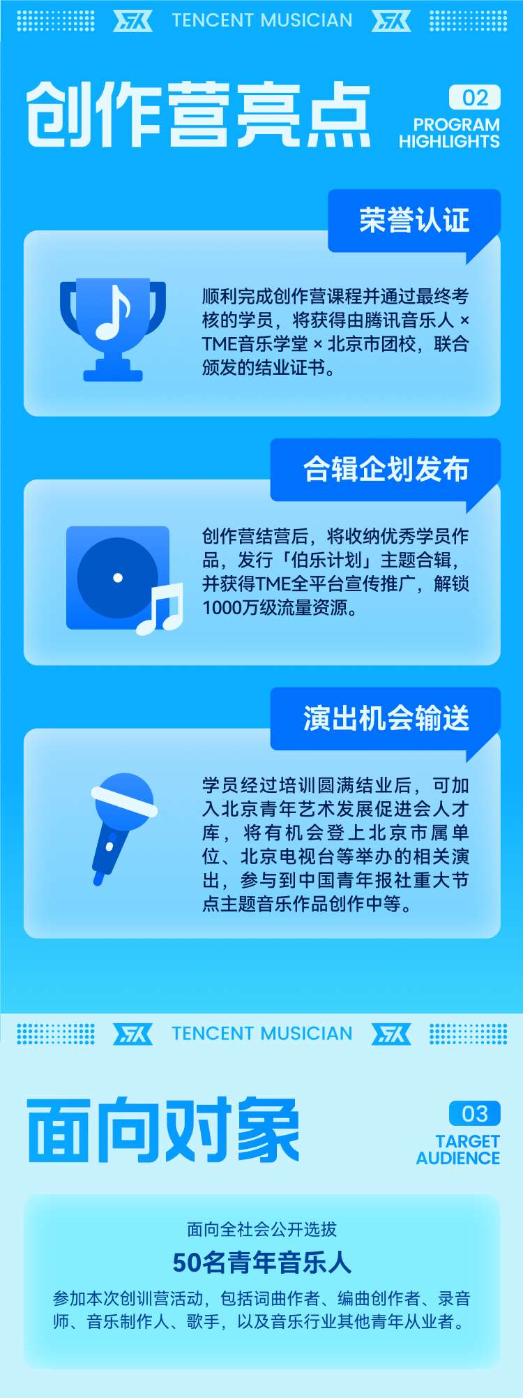 顺利结业的学员可获由腾讯音乐人、TME音乐学堂、北京市团校联合颁发的结业证书,并直接加入伯乐计划x青年音乐扶持计划扶持名单,并有机会登上北京市属单位、北京电视台等相关单位举办的演出舞台,参与中国青年报社重大节点主题音乐作品创作。创作营结营后,将收纳优秀学员作品,发行“伯乐计划”主题合辑,并获得TME全平台宣传推广,解锁1000万级流量资源。创作营优秀作品将有机会投稿至青年原创音乐征集计划,解锁后续更多奖励。