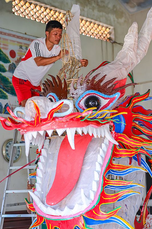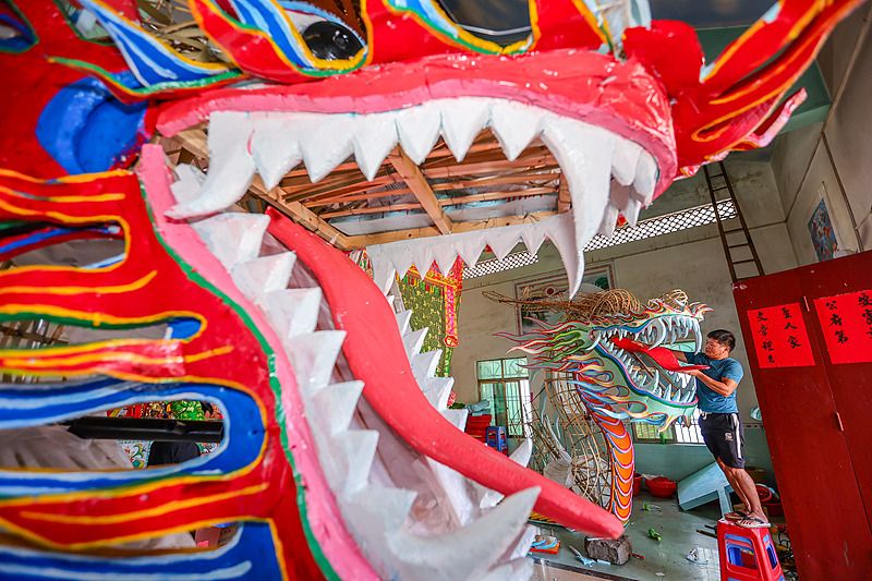 图为临高县新盈镇博岸村村民陈国新在制作龙头。