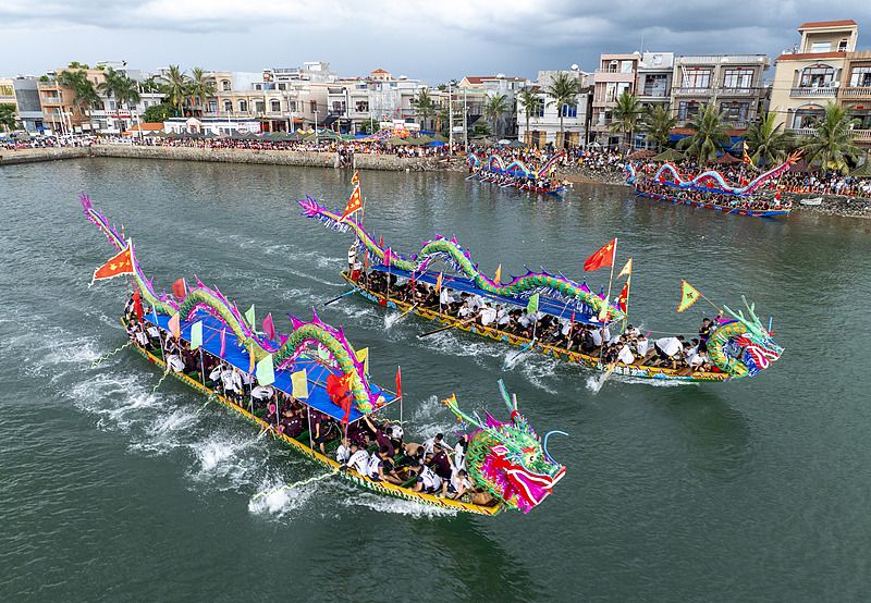 图为2024年6月10日,正值端午节,临高县新盈镇上演海上渔家龙舟赛。(无人机照片)