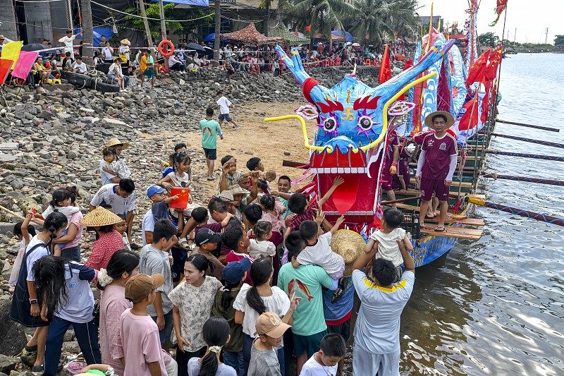 图为2024年6月10日,正值端午节,临高县新盈镇的民众争相摸龙头祈福。