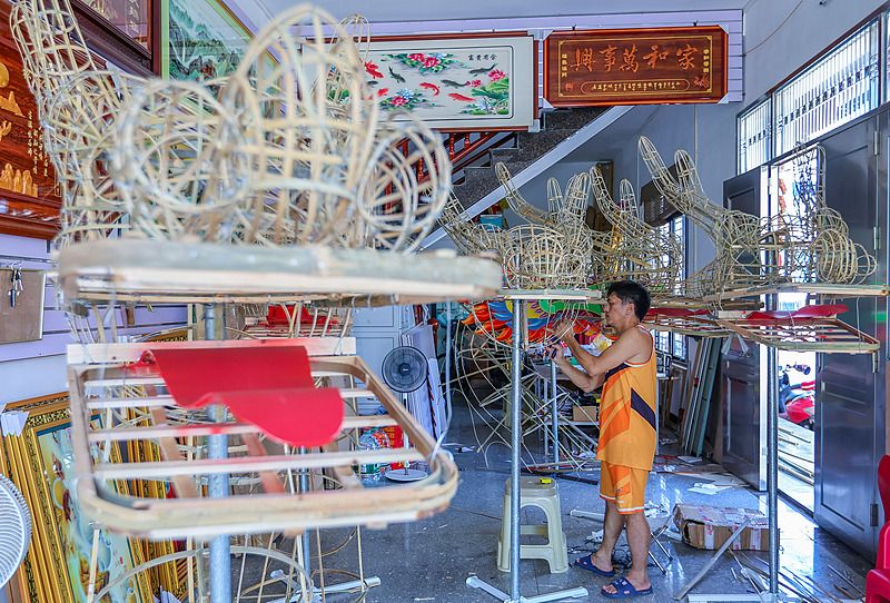 图为临高县新盈镇的民间艺人张高在制作龙头骨架。