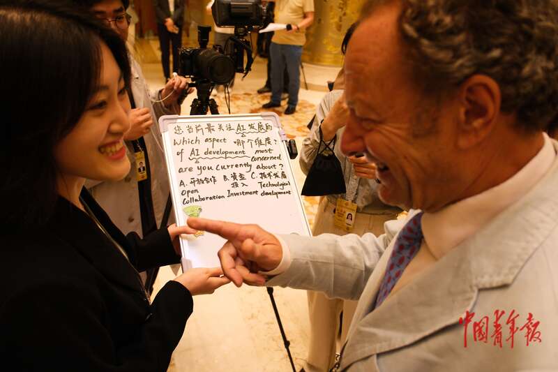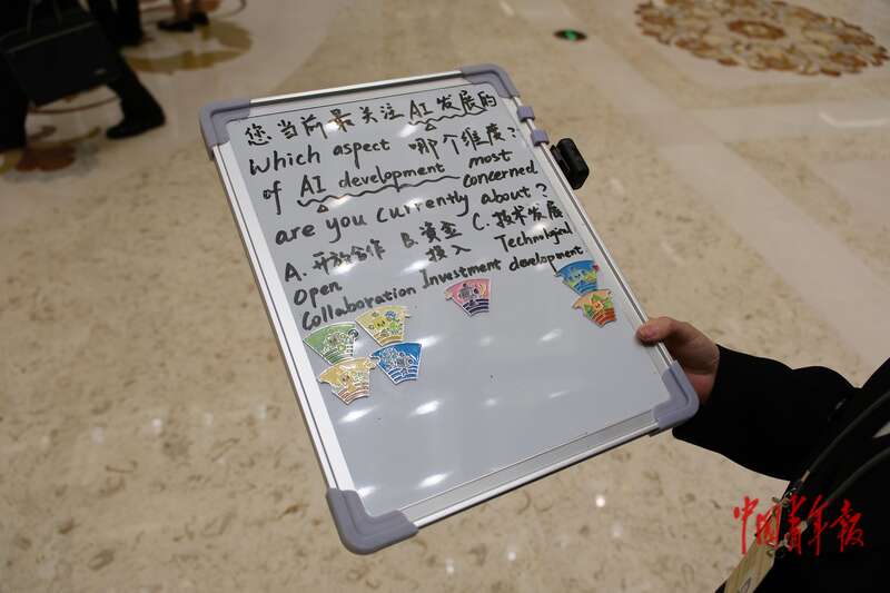 5月22日,北京,主题为“拥抱数智时代,携手共同发展”的2025年全球贸易投资促进峰会于当日举行。会前,一名记者手举提前准备好的手写板,请参会嘉宾选出“当前最关注AI发展的哪个维度”。中青报·中青网记者 田嘉硕/摄