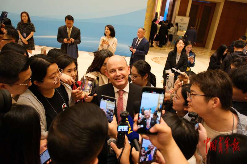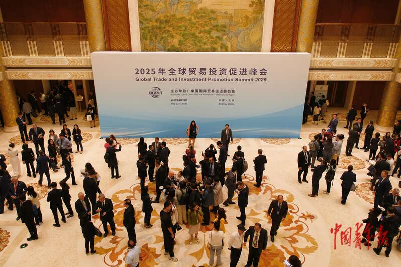 5月22日,北京,主题为“拥抱数智时代,携手共同发展”的2025年全球贸易投资促进峰会于当日举行。会前,参会嘉宾们在大厅拍照留念、接受采访。据了解,这次峰会境外参会机构及人员数量均为历届之最,来自48个国家和地区的政府部门、贸促机构和商协会及企业代表,驻华使馆和国际组织负责人800余人线下参加峰会。中青报·中青网记者 田嘉硕/摄
