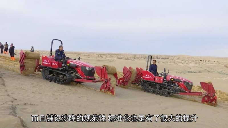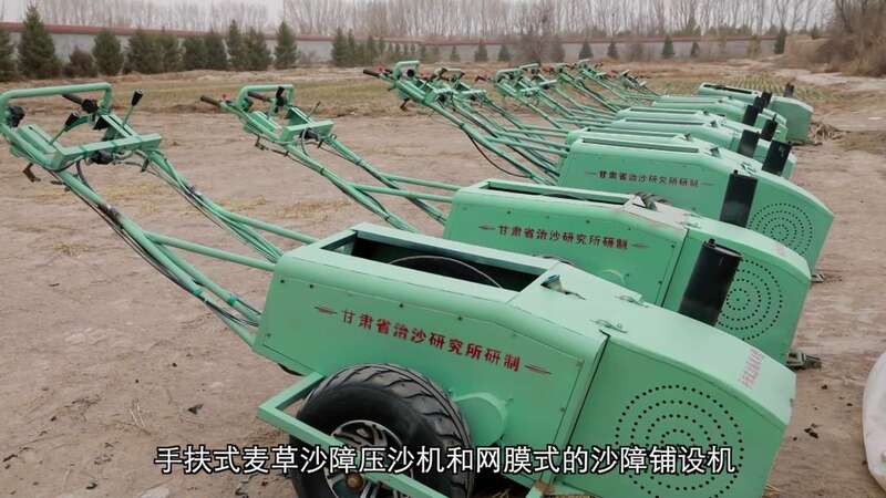 在甘肃“三北”工程河西走廊-塔克拉玛干沙漠边缘阻击战中,由甘肃省治沙研究所自主研发的网膜沙障铺设机、手扶式麦草沙障压沙机等各种“新式武器”也大显身手,有效提高防沙治沙的工作效率和质量。