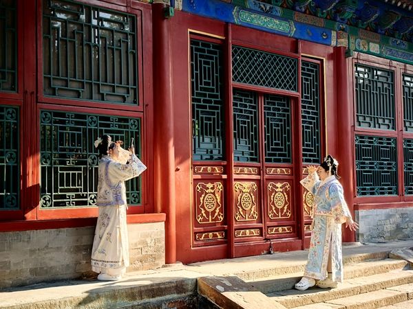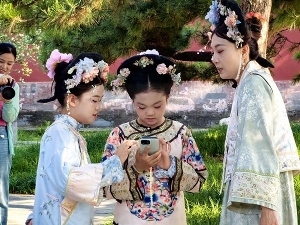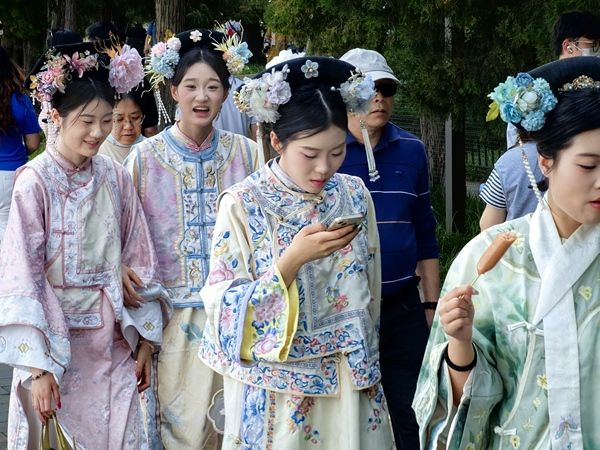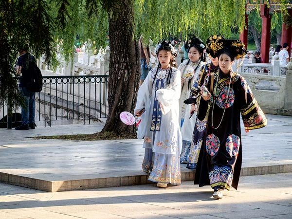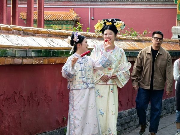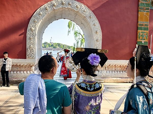 2025年5月24日,北京,端午假期临近,游客穿古装在北海公园游玩,妆容精致、插着旗头、手持扇子或糖葫芦作为拍照道具的“小主”“格格”“娘娘”们成为亮丽的风景线,红墙黄瓦古韵十足。