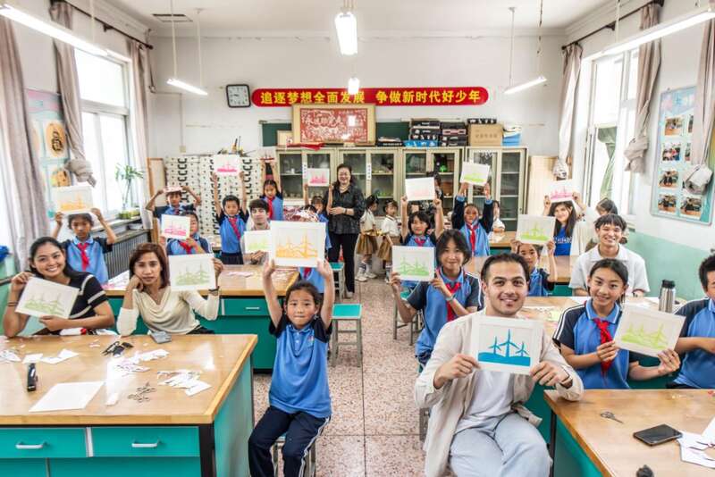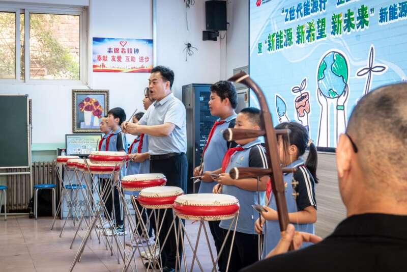 国华希望中心小学的学生现场表演了北京市非物质文化遗产项目“北京琴书”。在随后的艺术共创环节,中外学生们通过分组开展新能源主题绘画、非遗剪纸创作、共唱一首歌等形式,创作了一幅幅融合了光伏板、风车、果树等元素的剪纸和绘画作品。