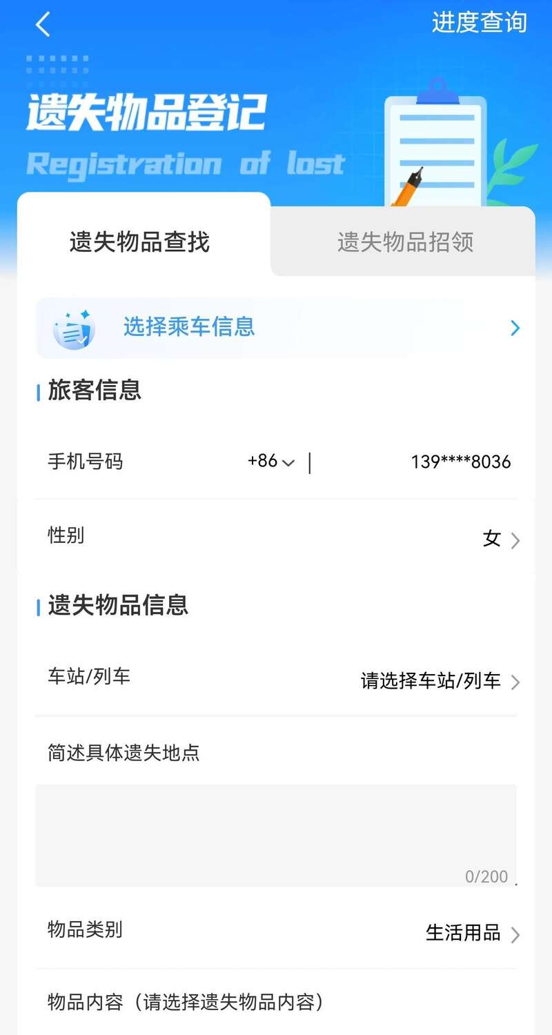 打开铁路12306App,在首页找到温馨服务中的“遗失物品查找”。进入登记页面后填写个人信息、乘坐的列车车次信息、遗失物品的信息,确认提交后可以在右上角进度查询中查看物品寻找进度。