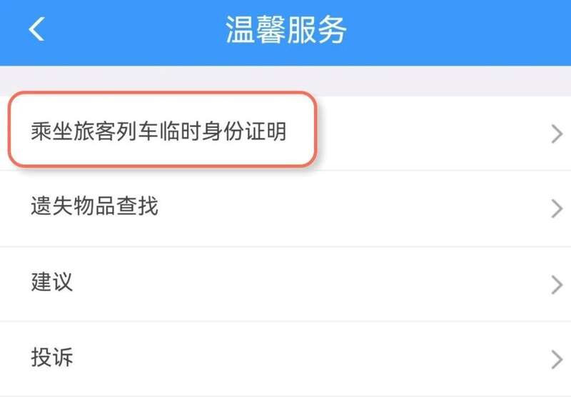 打开铁路12306App首页,点击温馨服务,选择“乘坐旅客列车临时身份证明”。