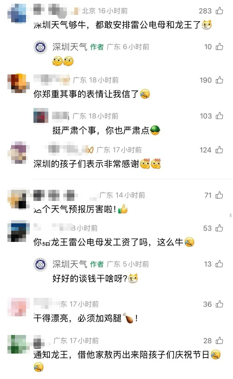 通知中提到:“深圳作为一座儿童友好城市,一座能听得见孩子声音的城市,针对本年度六一儿童节的天气情况,特做出如下通知,今年儿童节恰逢端午假期,儿童家长都有时间,为保障深圳广大家长陪同儿童出行游玩的便利,现要求6月1日深圳全市范围内不许下雨,遇极特殊情况,可在局部地区,零星下点短时阵雨,最高温度控制在31度,请雷公电母及深圳区域内各龙王知悉并落实执行。落款天庭儿童关爱办深圳办事处天气统筹部。”