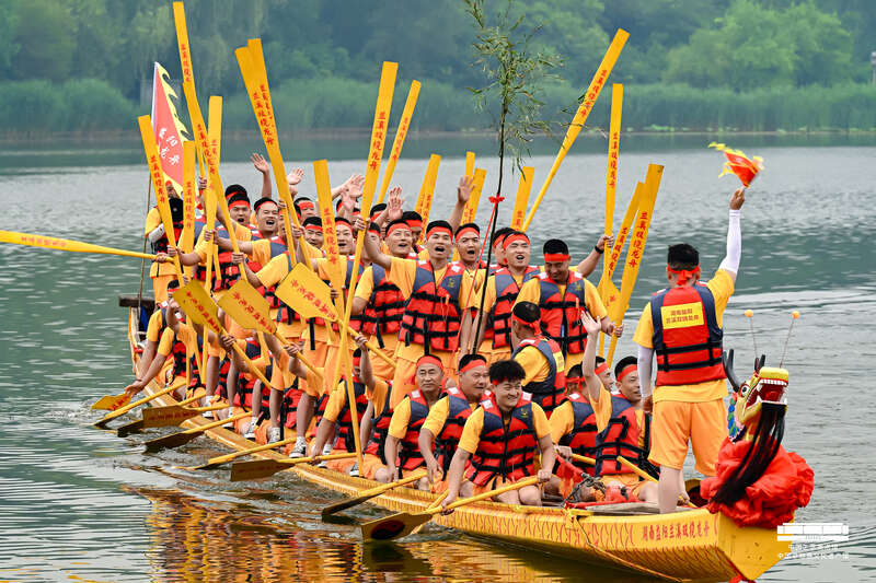 活动现场,随着高亢悦耳的兰溪山歌响起,指挥手一声令下,52名身着传统服饰的划手在激昂的鼓点与唢呐声中开始划桨,他们一边齐唱《龙船调》,“龙船喏!鼓响呀!划呀划噫呀!划啦划噫呀”,一边用手中的双桡变化出“大鹏展翅”“蜻蜓点水”等动作。高亢的号子声与飞溅的水花交织,将现场气氛推向高潮。