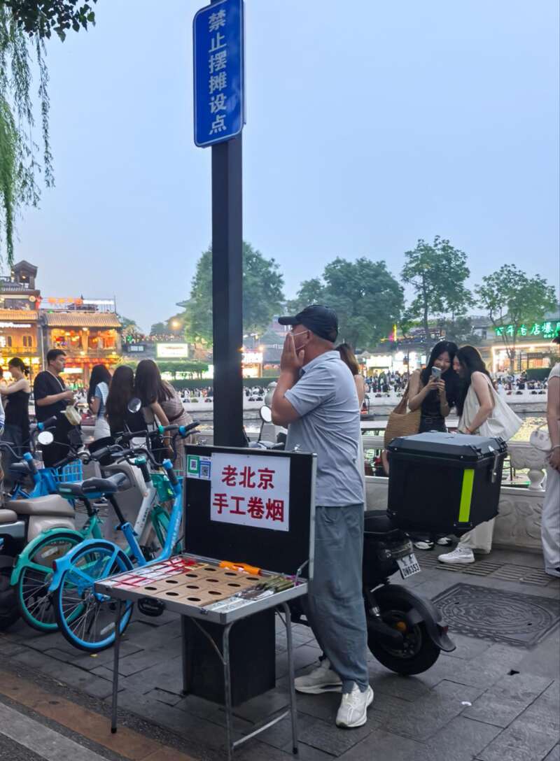 记者来到前海北沿,发现灯杆上挂着“禁止摆摊设点”的牌子。然而,一名男子赫然站在牌子下,摆摊售卖“老北京手工卷烟”。打开的手提箱里,摆放着铁盒装、纸盒装及散装的手工卷烟。在后海南沿,记者询问一个摊贩通常几点开始摆摊,他笑着说,“没准儿,管得可严了。”说罢,摊主左右张望一番,“老得准备着,大老远看见就得赶紧跑。”