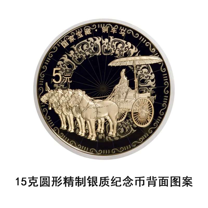 15克圆形银质纪念币背面图案为铜车马造型,衬以秦代纹饰,并刊“国家宝藏·铜车马”字样及面额。