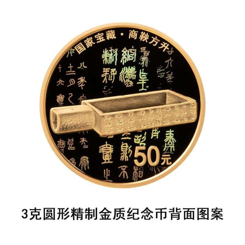 3克圆形金质纪念币背面图案为商鞅方升造型,衬以商鞅方升局部铭文字样,并刊“国家宝藏·商鞅方升”字样及面额。