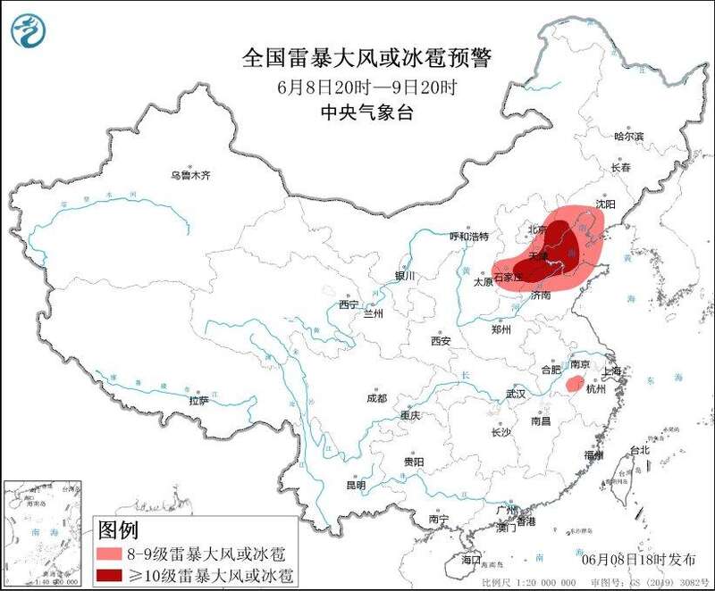 预计6月8日20时至9日20时,东北地区南部、华北中东部、黄淮北部等地的部分地区将有8级以上雷暴大风或冰雹天气,其中,辽宁西南部、河北东部、天津中东部、山东北部等地的部分地区将有10级以上雷暴大风,最大风力可达11级以上;西南地区东南部、华南西北部、江南大部等地的部分地区将有小时雨量大于20毫米的短时强降水天气,其中,湖南西南部、江西西南部、浙江中南部、福建西北部、贵州东南部、云南东南部、广西北部等地的部分地区小时雨量大于50毫米,最大可达80毫米以上。