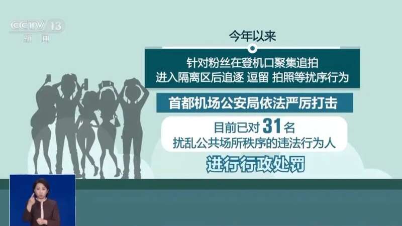 据悉,今年以来,针对粉丝在登机口聚集追拍,进入隔离区后追逐、逗留、拍照等扰序行为,首都机场公安局依法严厉打击,目前已对31名扰乱公共场所秩序的违法行为人进行了行政处罚。