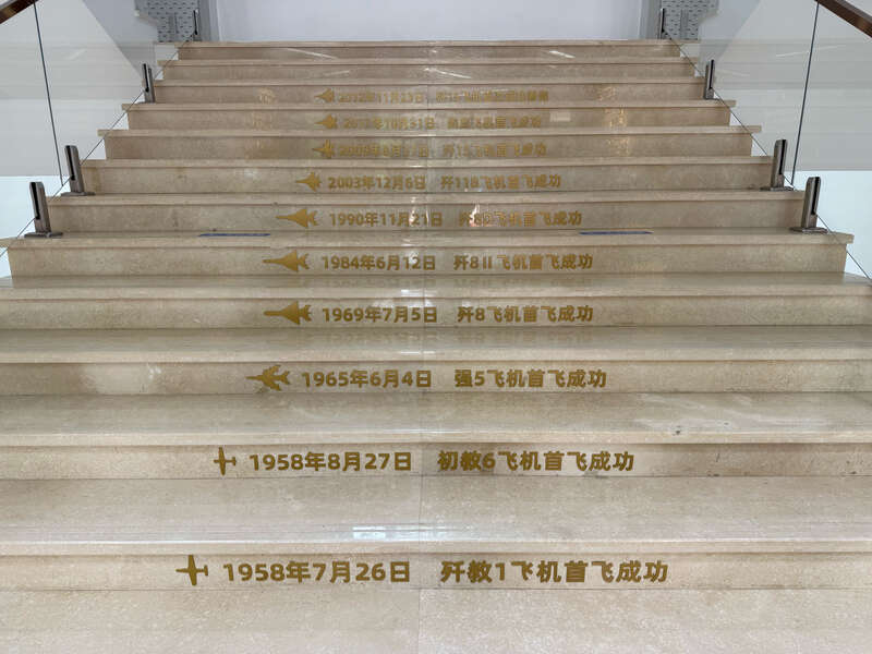 中国青年报客户端沈阳6月14日电(中青报·中青网见习记者 刘胤衡 记者 崔丽)沈阳航空科技馆内,一条承载历史的楼梯静静伫立,金色的侧立面上,记录着新中国航空事业攻坚克难、自主创新的编年史——从1958年7月26日我国第一架自行设计的喷气式教练机歼教一凌空翱翔,到2012年11月23日歼-15舰载战斗机在中国航母上首次成功着舰……每一个日期,每一架飞机,凝聚着一代代航空人为航空救国、航空报国立下的赫赫功勋。