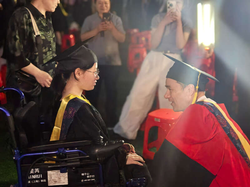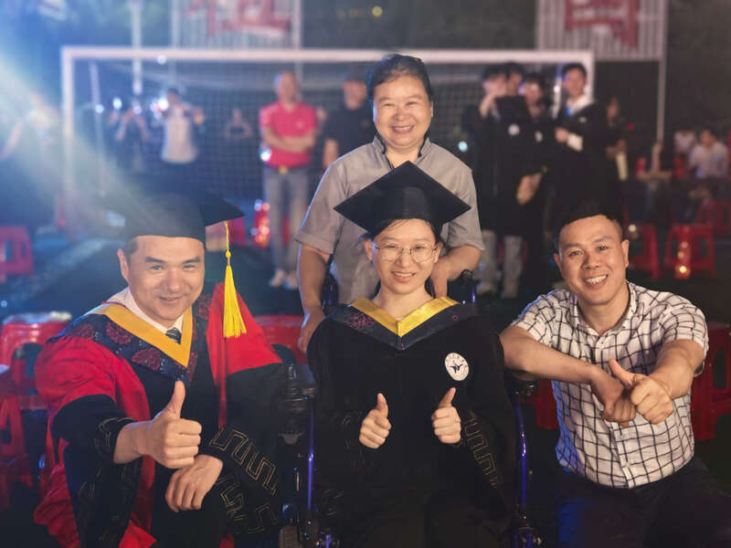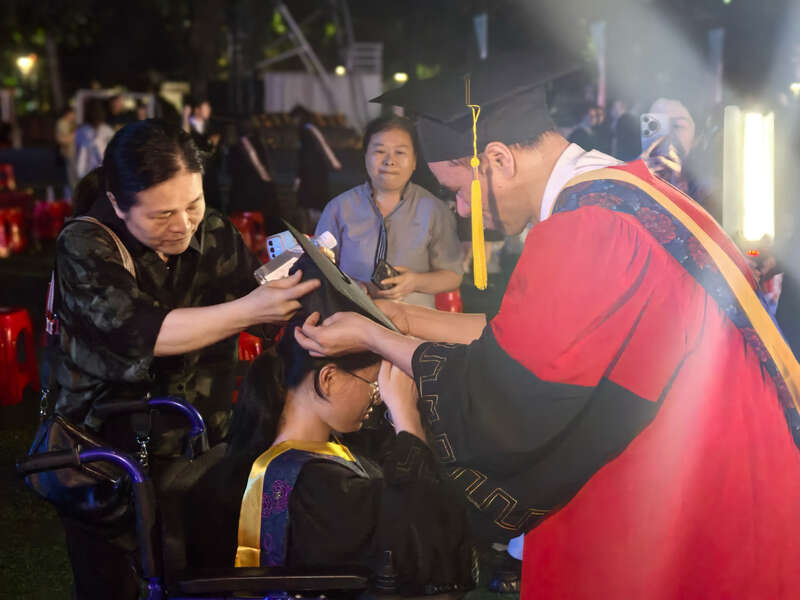 马雪丹同学因肢体残疾,坐着轮椅参加毕业典礼。浙江万里学院大数据与软件工程学院院长王仁芳教授,快步走向毕业生队伍,与班主任邹运兰老师俯身协作,亲手为马雪丹同学戴上象征荣誉的学士帽,轻轻地拨正帽穗,用最温暖的仪式感为她的求学之路加冕,并一同蹲下来与她合影留念。