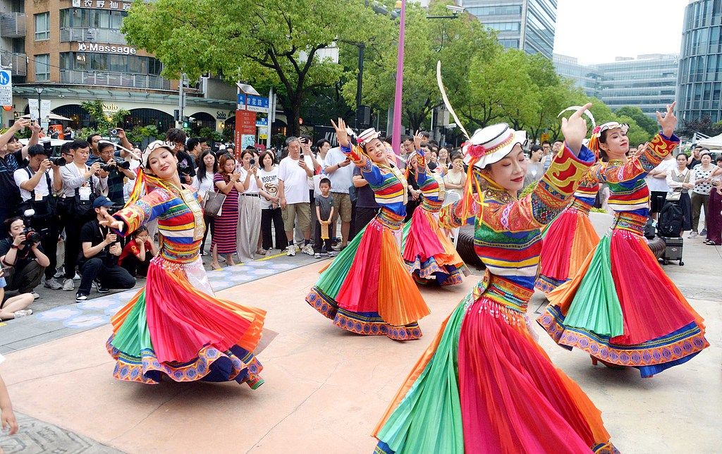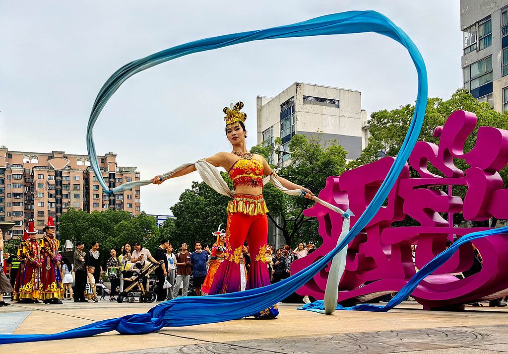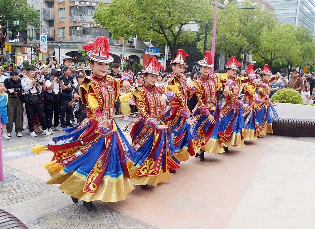 2025年6月14日,上海杨浦区大学路上洋溢着浓浓的甘肃民族风情。一场“丝路非遗”精彩快闪巡游活动成了最耀眼的文化风景线。裕固族舞蹈《盛装舞》、白马藏族舞蹈、敦煌神韵《飞天伎乐》等表演节目轮番上演,从多角度呈现甘肃深厚的文化底蕴与多元民族风情,盛装打扮的演员们同时为当地的旅游文化做推介,现场吸引了众多市民游客驻足观看。