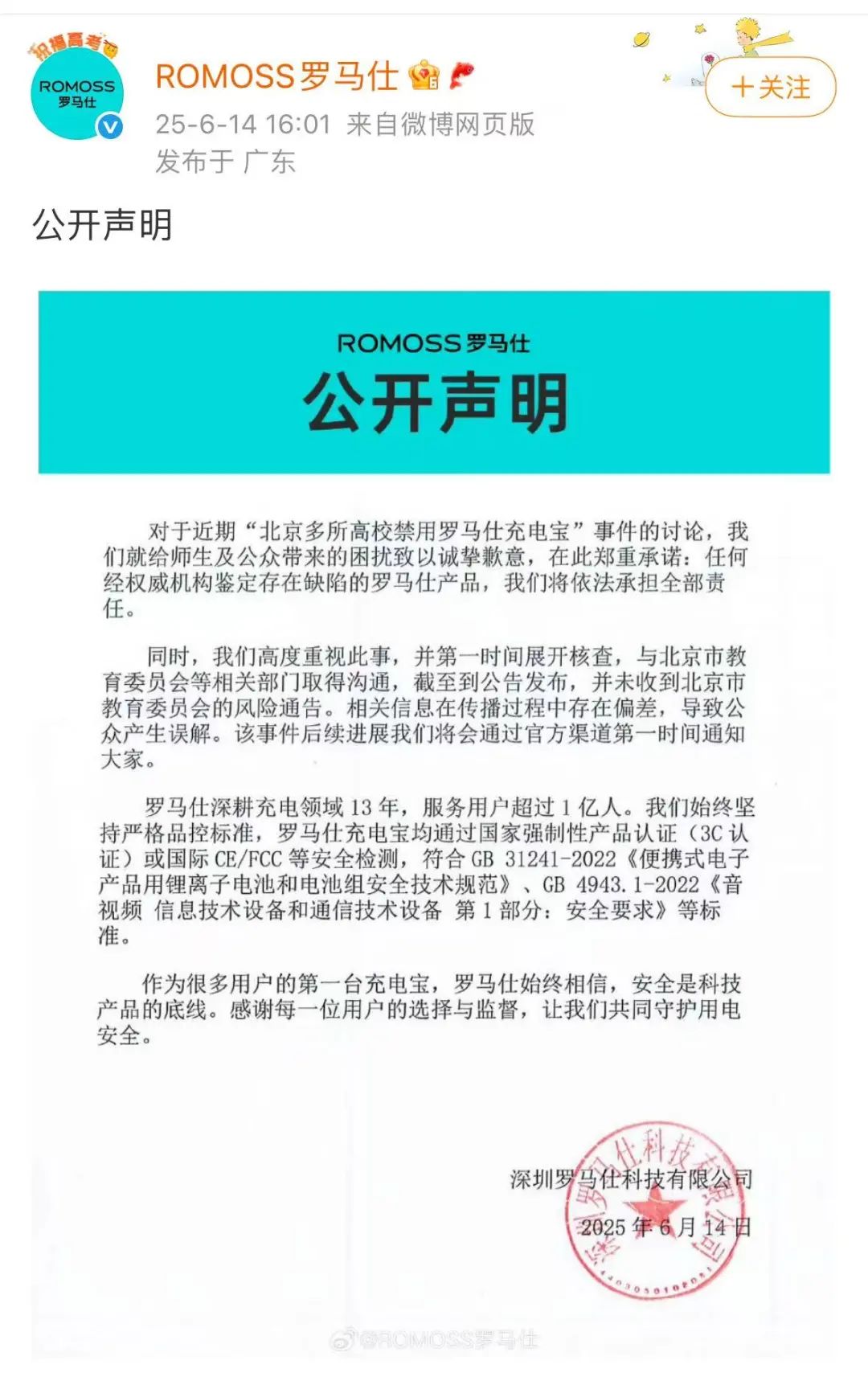 对此,涉事品牌方声明表示,对于近期“北京多所高校禁用罗马仕充电宝”事件的讨论,其就给师生及公众带来的困扰致以诚挚歉意,并承诺任何经权威机构鉴定存在缺陷的罗马仕产品,将依法承担全部责任。