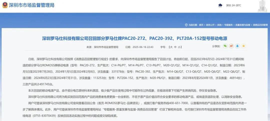 6月16日,深圳罗马仕科技有限公司发布消息称,按照《消费品召回管理暂行规定》的要求,向深圳市市场监督管理局报告了召回计划,将自即日起,召回2023年6月5日-2024年7月31日期间制造的部分罗马仕ROMOSS牌移动电源,三款产品共计491745台。