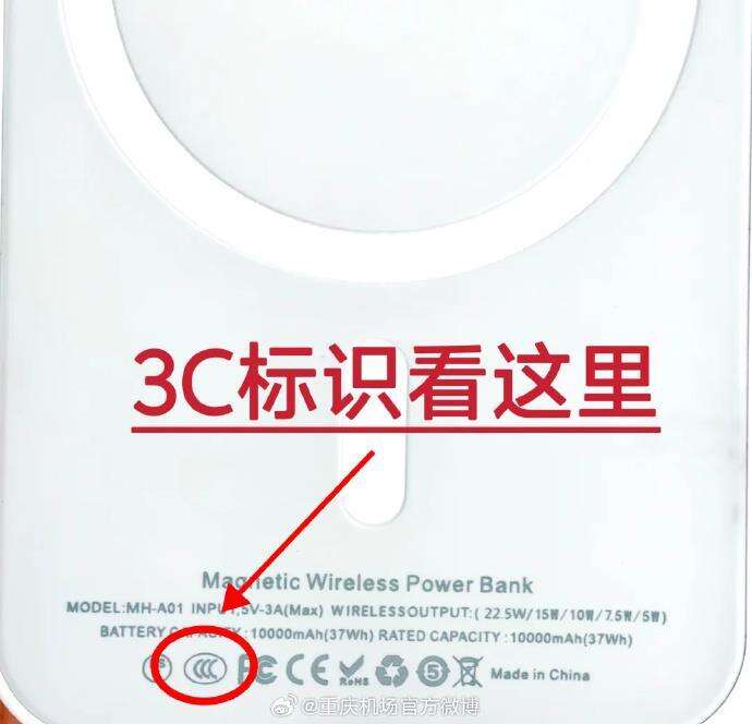 标识:旅客禁止携带没有3C标识、3C标识不清晰的充电宝乘坐境内航班。