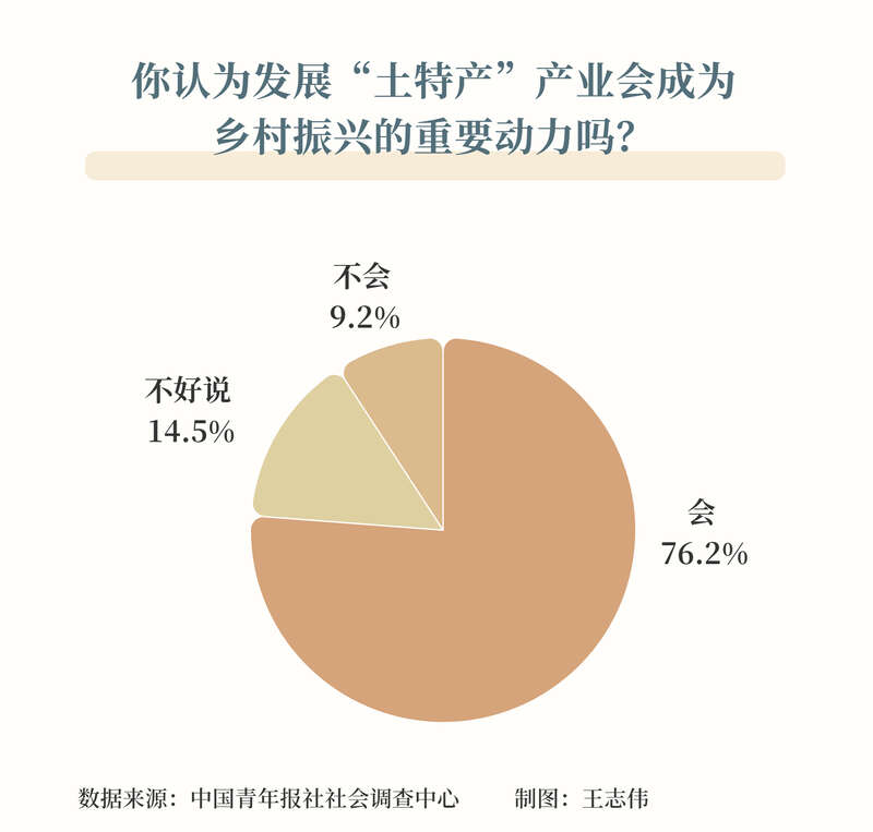 产业旺促乡村兴,小小“土特产”引动乡村发展大能量。近日,中国青年报社社会调查中心联合问卷网(wenjuan.com)对1506名受访者进行的一项调查显示,76.2%的受访者认为“土特产”产业会成为乡村振兴的重要动力。