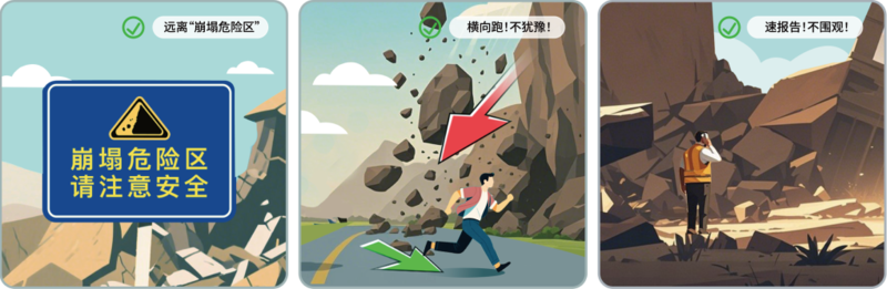发现崩塌后,切勿慌乱,在确保个人安全的情况下立即拨打报警电话。崩塌可能连续发生,切勿立即返回现场捡拾物品或围观。