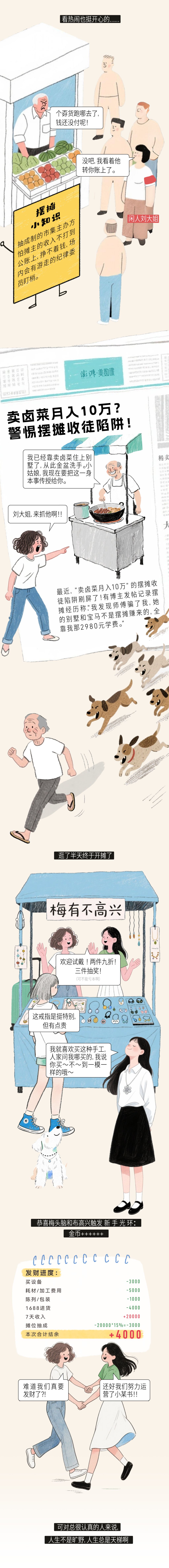 3 年前《每日人物》的报道写道:“对于每一个选择摆摊的人来说,地摊就像是一个容器,装载着不同的人生经历,给没有方向的人提供一个选择和尝试的机会。”