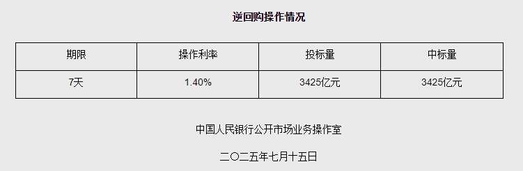 中新网7月15日电 据央行网站消息,2025年7月15日中国人民银行以固定利率、数量招标方式开展了3425亿元逆回购操作。具体情况如下: