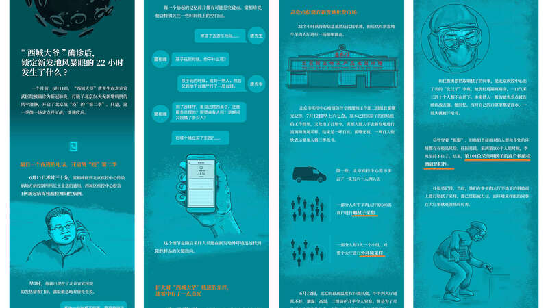 在中国青年报社工作的五年里,我常常面对一个挑战:如何让政务、科技等“硬核”内容,在大众视野中绽放温度?2020年北京新发地新冠疫情报道,我负责《一张图读懂:北京疾控22小时锁定新发地始末》视觉设计,面对繁复流调信息与时间点,怎样让它们变得立体可感?我尝试用信息可视化重构逻辑,以蓝橙渐变色的强烈碰撞,渲染追根溯源的紧迫;把流调里的温暖细节,化作漫画情景——疾控人员穿着防护服争分夺秒的身影,都成了画面里鲜活的注脚。那时我懂了,视觉设计从不是简单美化,而是给事实披上“外衣”,让故事能触及大众心底。